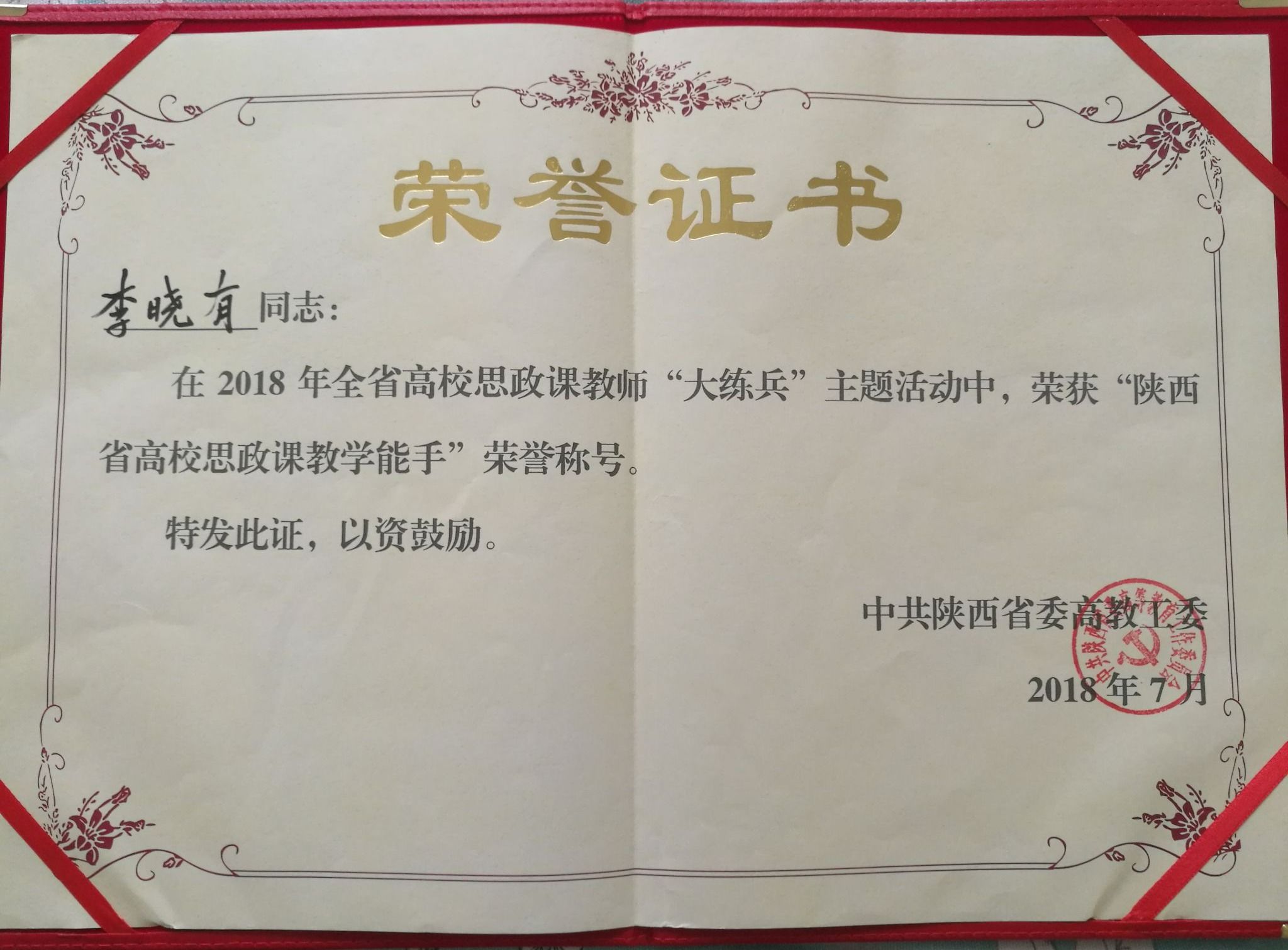 2018年全省高校思政课教师“大练兵”——李晓有获“陕西省高校思政课教学能手”荣誉称号