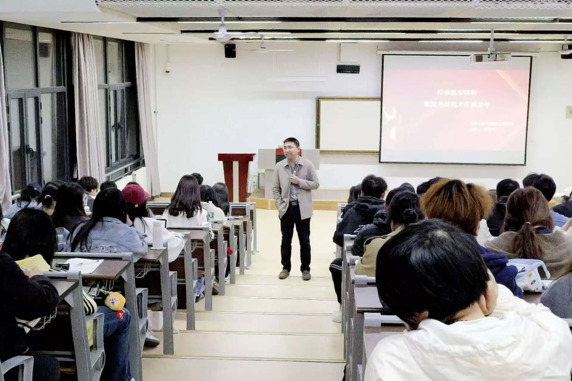 第二篇章聚焦“延安精神对新时代青年的价值引领”。赵海龙老师着重强调,革命传统教育要从源头抓起,在知识传授的同时强化价值塑造。他指出,延安精神蕴含的“信念力量”,如同坚固基石,筑牢青年理想之基;“务实作风”则似激昂号角,激励青年勇担时代使命;“吃苦品格”赋予青年直面困境的无畏勇气;“奋斗美德”鼓舞青年拼搏不息,向着梦想不断奋进。