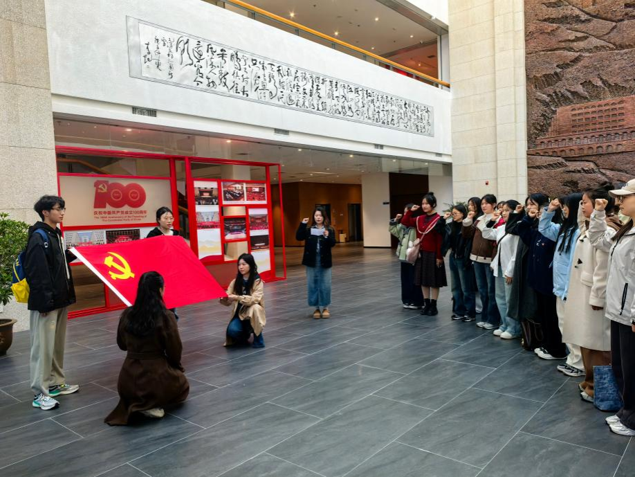 全体党员在党旗下重温入党誓词。大家纷纷表示新时代青年要以革命先辈为榜样,以更加饱满的热情和昂扬的斗志,砥砺前行,践行青春向党担使命的誓言。