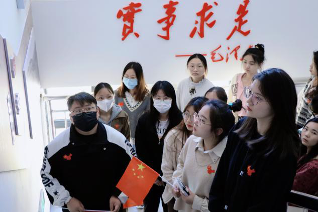 圣地青马宣讲团宣讲部部长屈欣悦为同学们详细地讲解了体育365官网楼梯文化墙——中共中央在延安的十三年党知识。