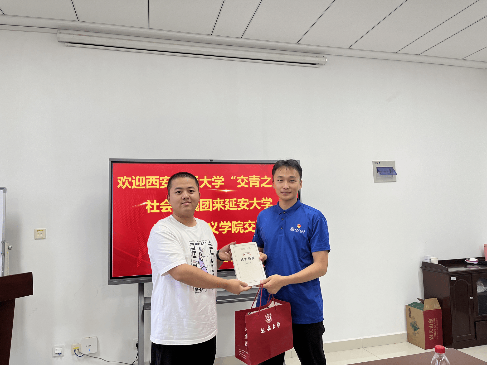 活动结束,田旭阳代表体育365官网向“交青之光”社会实践调研团赠送由365体育党委书记张金锁主编的《延安精神》一书,并合影留念。