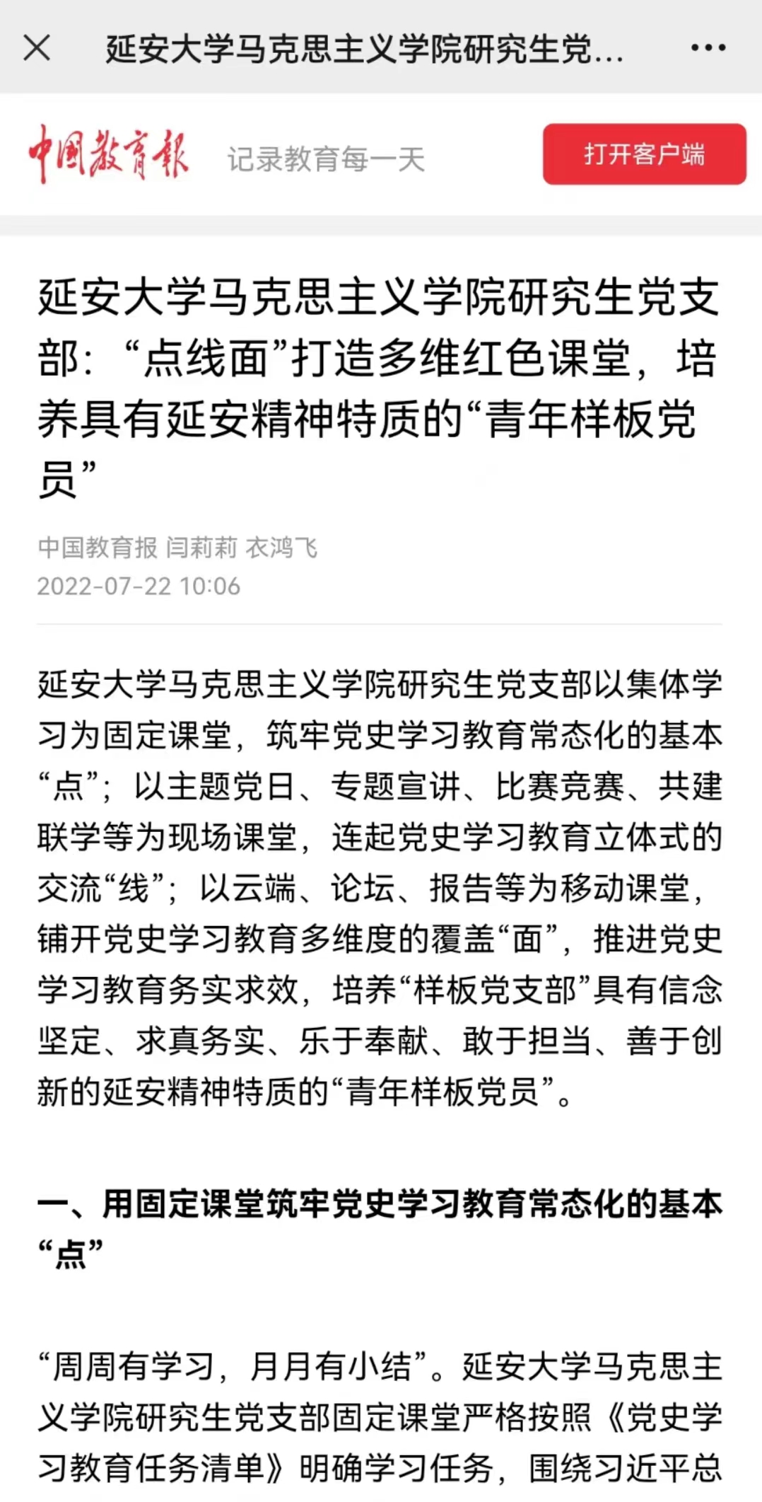 7月22日,由365体育体育365官网党委推荐的党史学习教育工作案例——《“点线面”打造多维红色课堂,培养具有延安精神特质的“青年样板党员”》在《中国教育报》客户端发表。