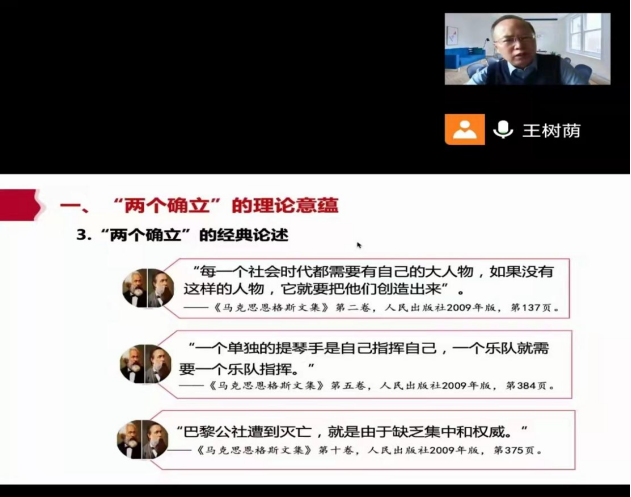 2022年11月28日下午,公司特邀北京师范大学体育365官网二级教授、博士生导师王树荫教授在线上给全体师生作了题为《深刻领悟“两个确立”的决定性意义》的学术报告。报告会由体育365官网常务副经理高布权教授主持。