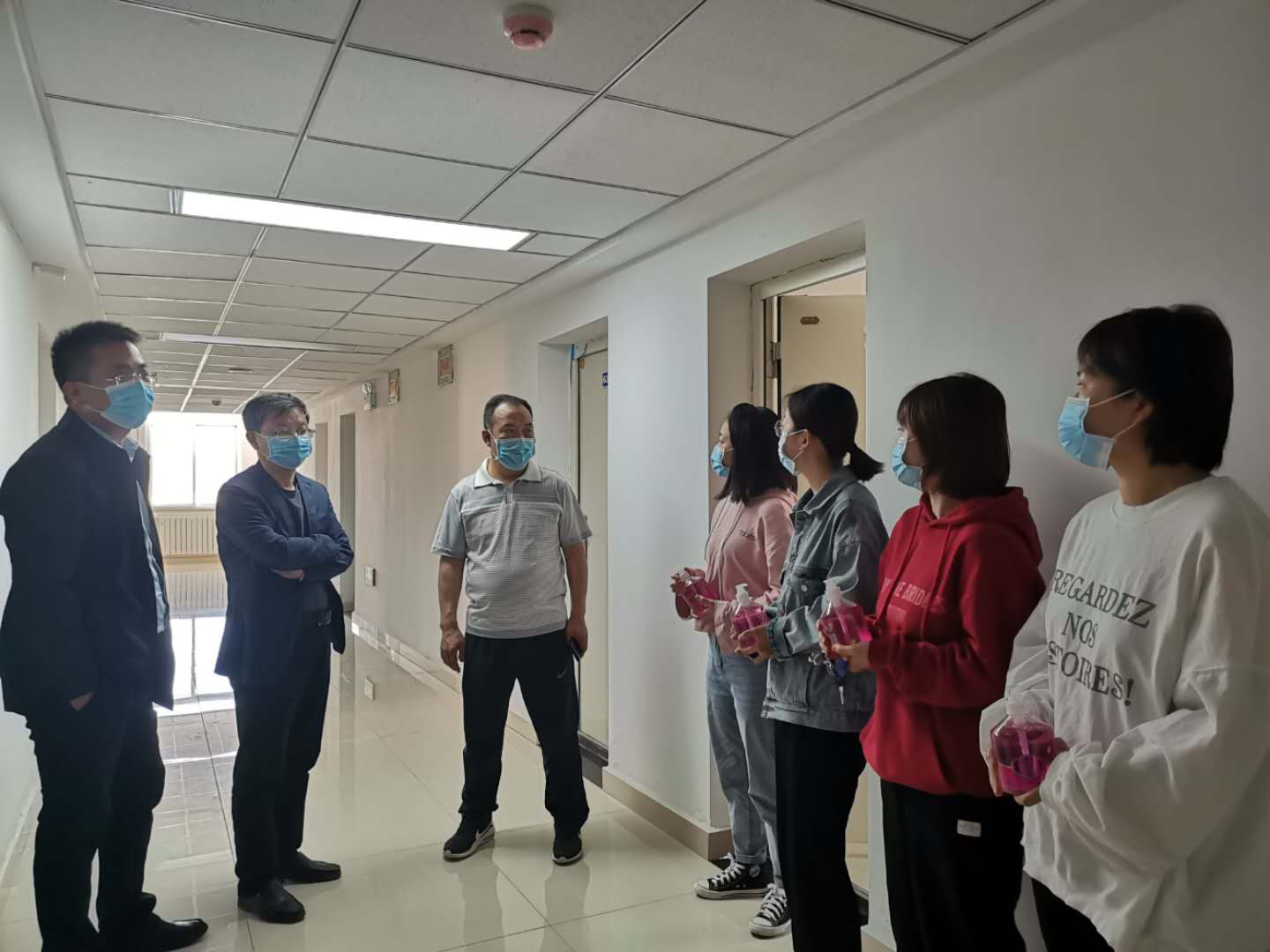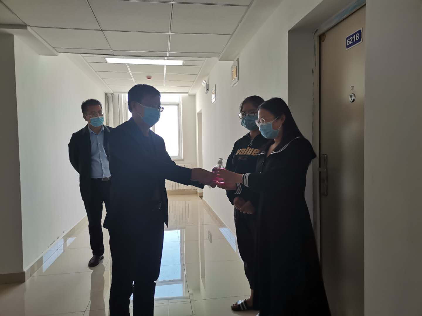 来到员工宿舍,三位院领导与同学们进行了亲切的交流,询问了同学们的身体状况、防疫物资准备情况、饮食居住生活情况等,并亲自将公司准备的洗手液发放到每个宿舍,同时叮嘱同学们继续注意个人防护,严格落实一日三次体温测量和体温异常及时报备制度,在公司封闭管理期间未经批准切勿私自外出,有任何需要帮助、解决的问题及时与公司沟通、联系。另外,院领导还对返校同学的论文撰写情况、就业进展情况等进行了详细的了解,并引导同学们在完成毕业论文设计的同时树立正确的择业观、就业观,以积极的心态面对学习和工作。