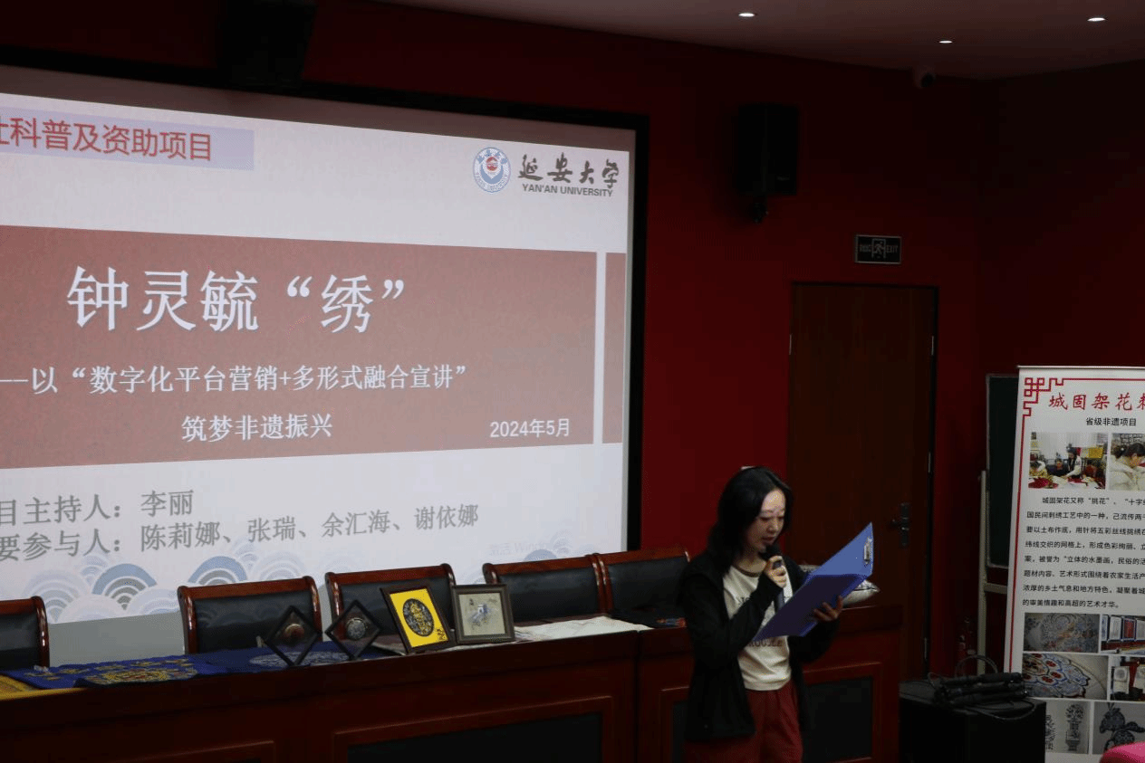 活动第一项,由宣讲团成员代表进行非遗文化的宣讲,介绍省级非物质文化遗产“城固架花”刺绣的历史及传承现状。宣讲团成员在介绍架花的过程中说道:“随着现代生活方式的变迁和市场需求的改变,城固架花在一定程度上遇到了发展困境。传统手工艺人才的培养受到了一定的影响,从而城固架花传统工艺人才日渐稀缺,城固架花产品的市场需求受到也受到了影响。”因此,她建议我们需要不断创新城固架花的传统艺术产品,将刺绣艺术与现代设计相结合,创造出更具时代特色和市场需求的作品。