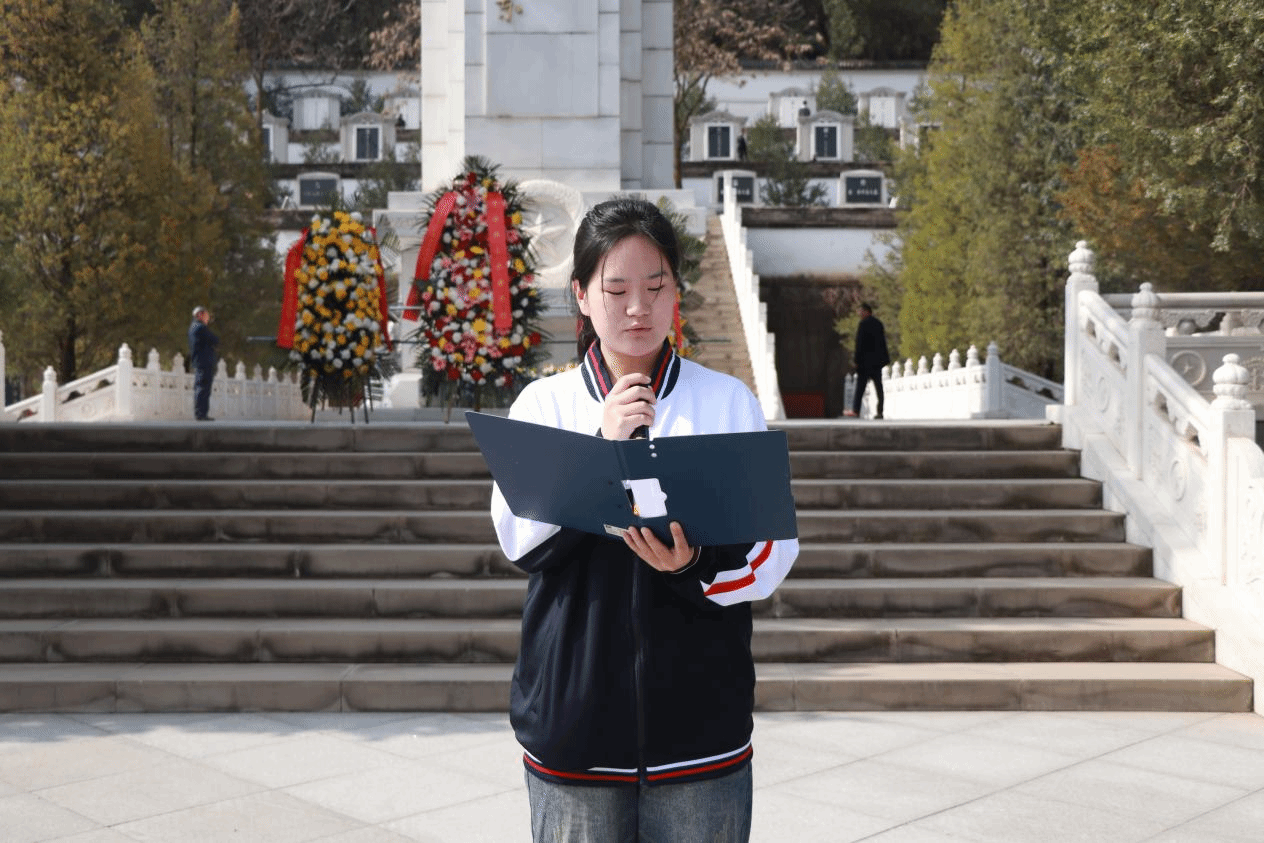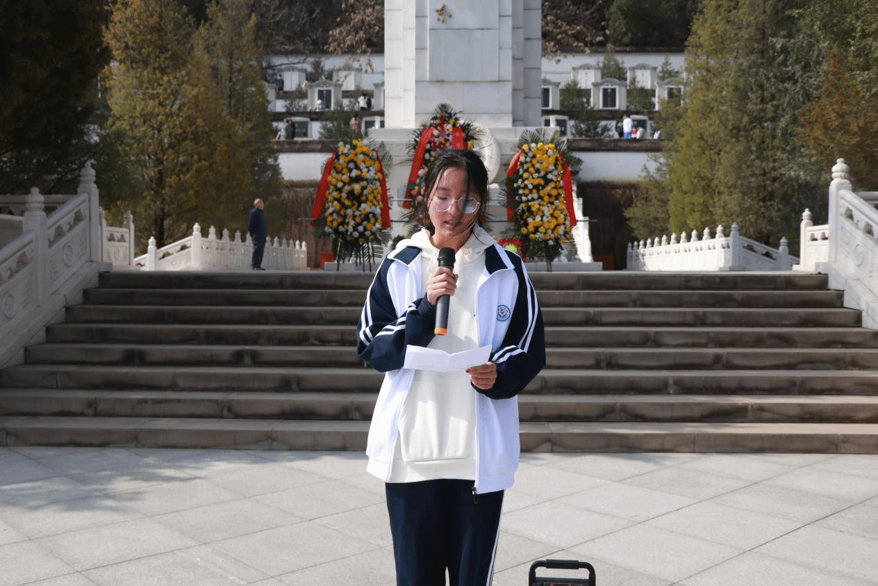 青山有幸埋忠烈, 浩气无形化丰碑。在纪念碑前,同学们庄严肃立,马玉同学带领大家行鞠躬礼,并带领大家宣誓。庄严的时刻,郑重的誓言,不能忘的是革命先烈的精神意志,不能舍的是革命先烈的光荣传统,不能停的是接续创造的辉煌业绩。