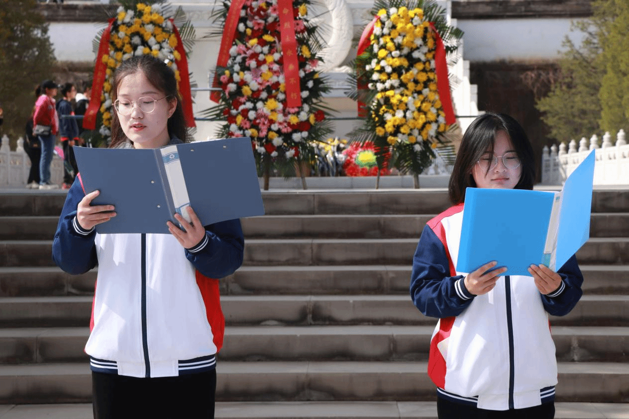 吴苏怡同学和李雨珂同学合诵《清明》,王思雨同学和孟申奥同学合诵《清明》。“清明时节雨纷纷,路上行人欲断魂。”在烈士墓前,在四月的春风里,在他们的朗诵中,悲情从字里行间流出,将对烈士的哀思与敬仰传递给每一位在场的同学。