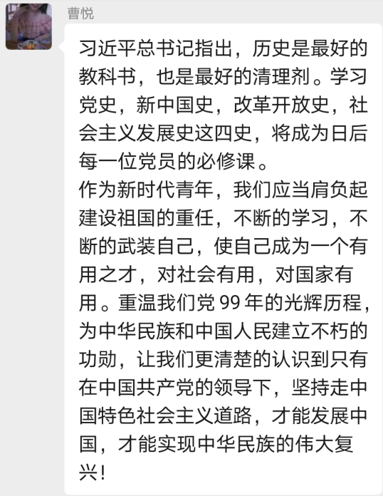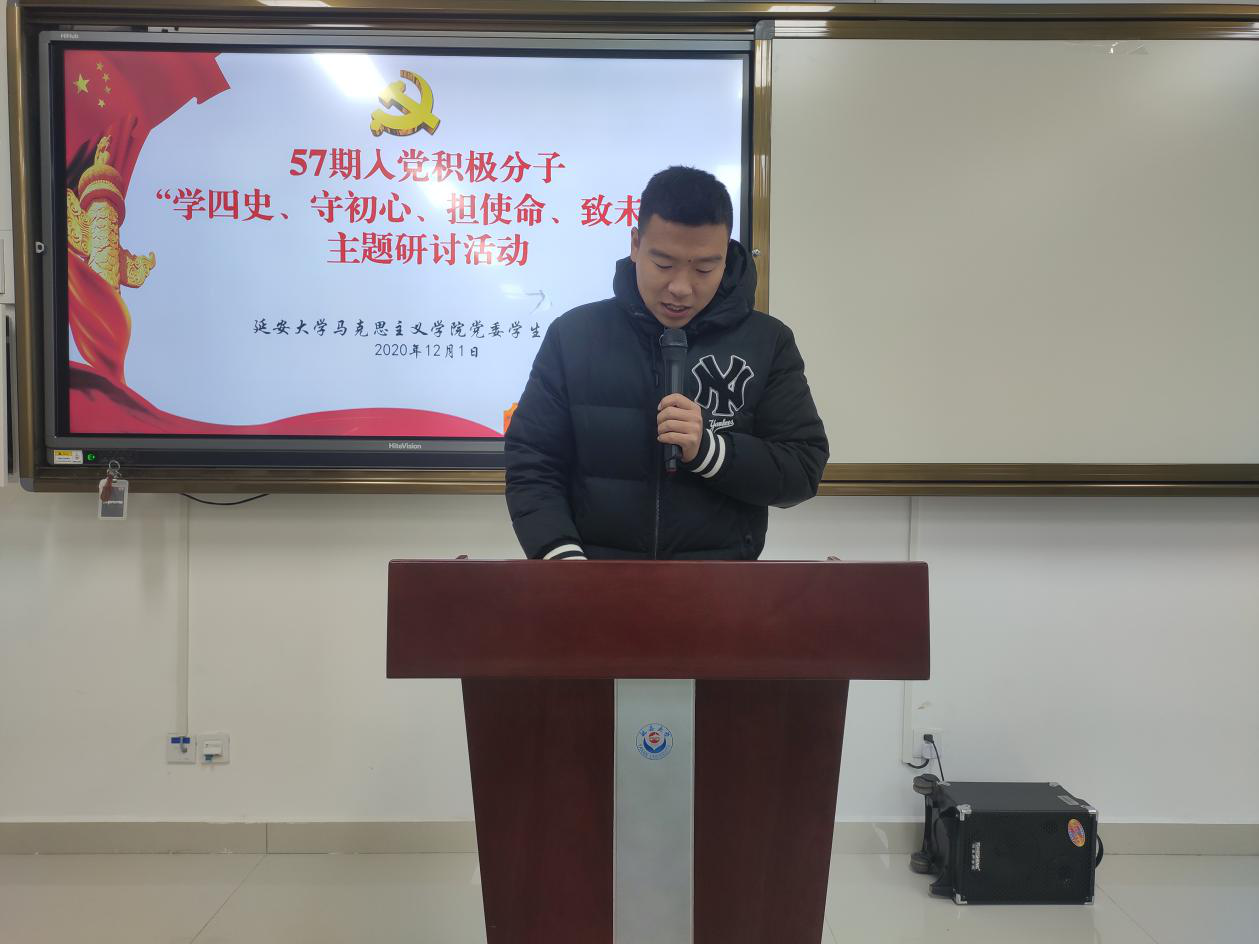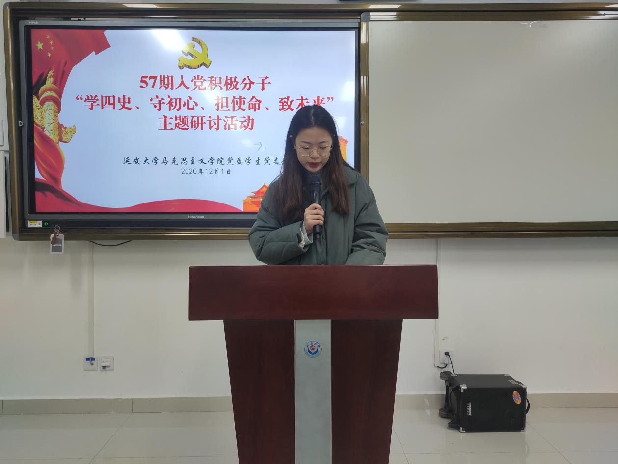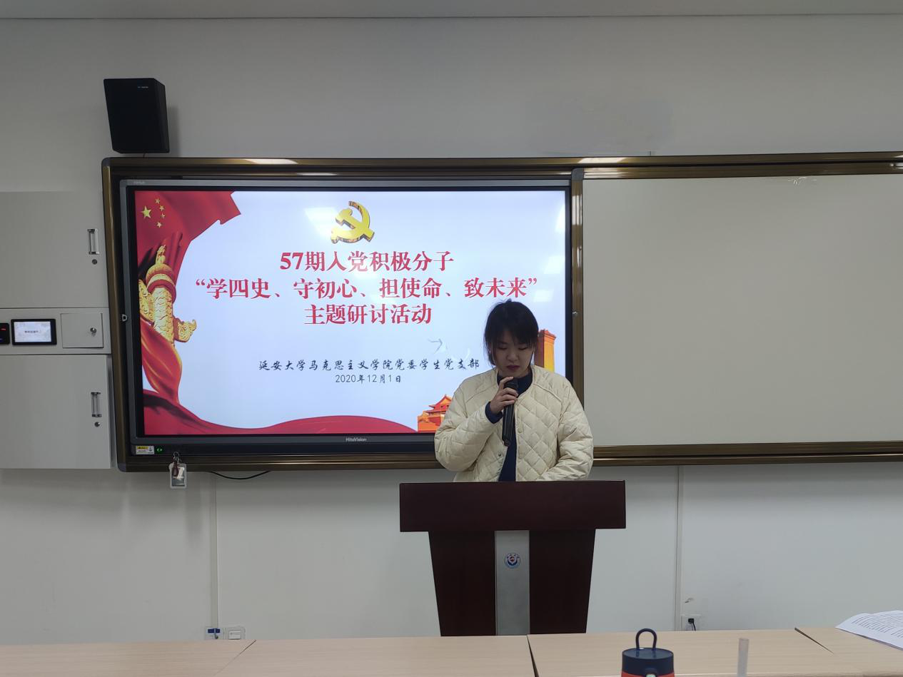 “担使命、致未来”线上研讨会于2020年12月1日在积极分子培训群举行,由员工党支部纪检委员贺宁宁同学主持。首先,由贺宁宁同志向参会积极分子介绍本次研讨内容:1、分享学“四史”心得体会;2、结合自身实际谈谈如何争做一名合格的中国共产党党员;3、分享相关主题视频及报道。