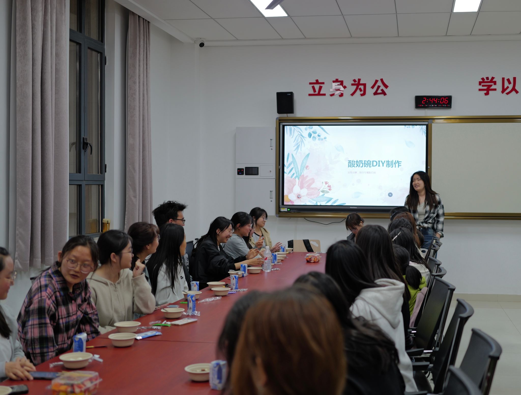 在“饮食与情绪”科普环节,主讲人结合色彩心理学与营养学知识,揭秘酸奶中益生菌对情绪的调节作用,以及红色(热情)、绿色(平静)、黄色(活力)等食物色彩如何成为“心情调节器”。“原来选对食材颜色真的能治愈坏情绪!”同学们惊叹于食物与心灵的奇妙联结,也为后续的DIY创作埋下了灵感的种子。