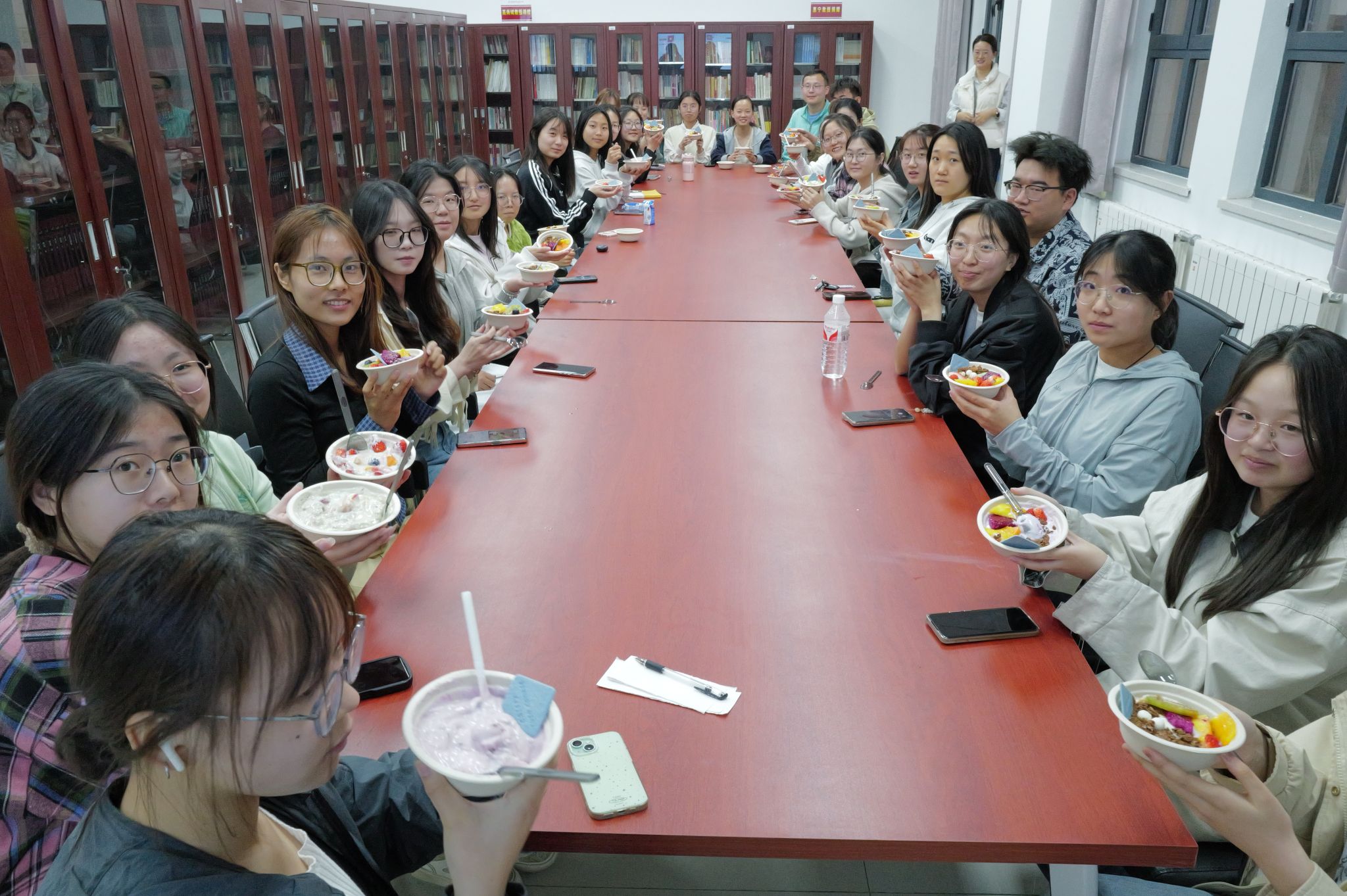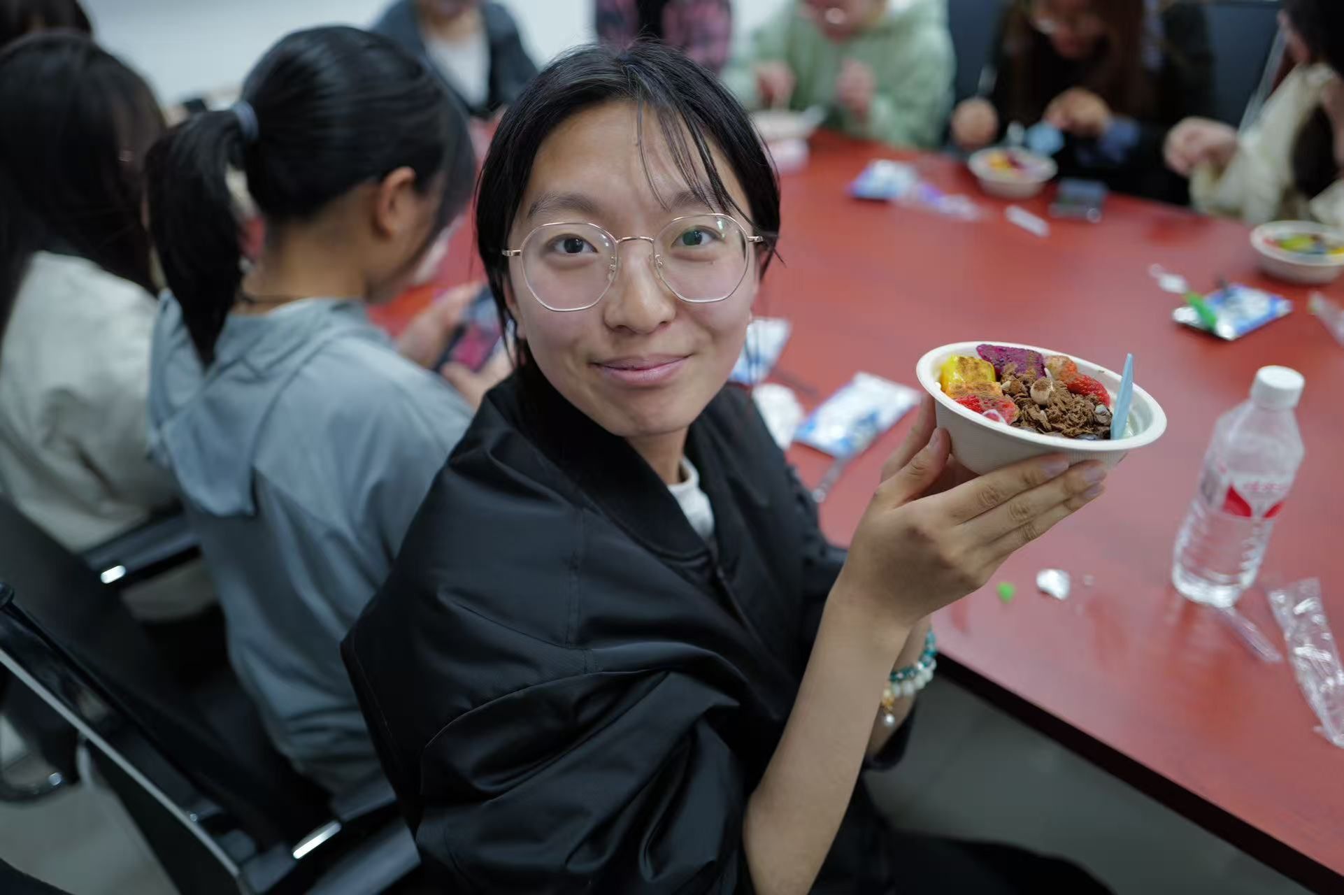 活动尾声,同学们感慨道:“专注做酸奶碗时,烦恼好像都消失了!”“认识了新朋友,今天是被治愈的一天!”一句句真挚的分享张贴在“心情墙”上,成为彼此心灵共振的温暖见证。赵海龙老师表示:“公司会持续倾听同学们的心声,以大家的需求为导向,策划更多形式新颖、内容走心的心理工坊活动,让每位同学都能在轻松温暖的氛围中收获心灵成长。”最后,集体合影定格下这场甜蜜之旅,每个人手中的酸奶碗不再只是一份甜点,更是一次与自己对话的契机——通过专注创作,同学们学会了用温柔的方式对待自己,让“自我关怀”成为可触摸的成长印记。