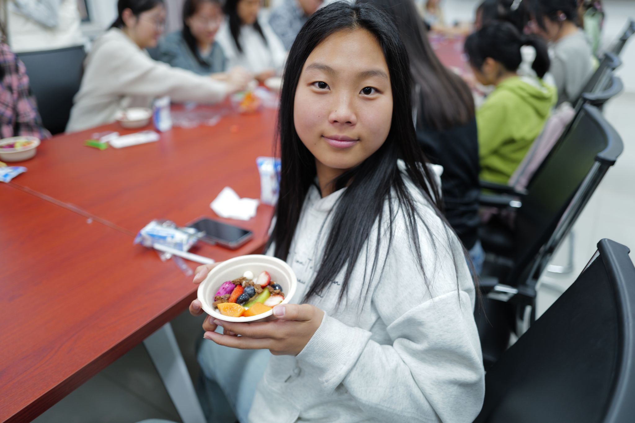 以安慕希酸奶为基底,搭配每日麦果麦片、新鲜莓果、饼干碎、巴西梅粉等配料,同学们化身“心灵甜点师”:有人用芒果片拼出笑脸,命名“元气重启”,寓意用甜食驱散学业压力;有人用蓝莓与抹茶粉勾勒出“星空下的教学楼”,寄托对校园生活的热爱;还有同学在酸奶碗上贴满彩色糖珠,写下“今天的我超甜”的情绪标签。每一份作品都是独一无二的内心独白,承载着对自我的温柔对话。