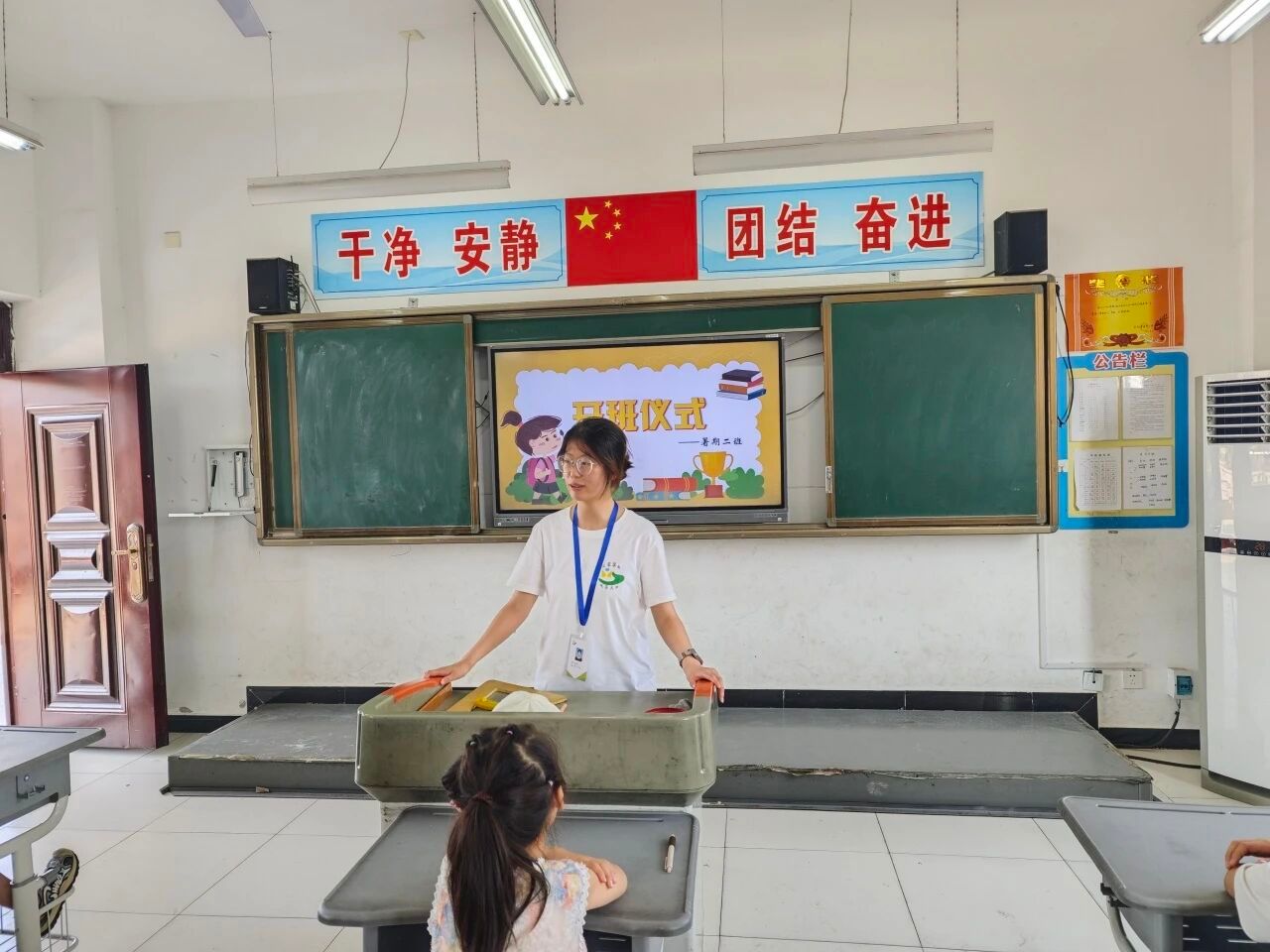根据赵波同志和吕红江董事长的建议,为促进东赵村乡村教育发展,实践团队开展暑期支教活动,团队举办了以“七彩暑期”为主题的开班仪式,包括安全教育、课程介绍、破冰行动三个主要内容。在两位班主任老师的安排下,员工按年级大小分为两个班,并有条不紊地开展课堂活动。