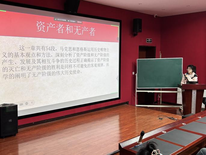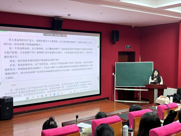 段学慧老师对王雪同学的分享进行了点评,她首先指出,这种分段落来读原著的方法是非常正确的,其次解答了王雪同学在读原著过程中所遇到的困难,最后指出,作为一名马院员工,共产党宣言是我们的必读篇目,我们要多读原著,读好原著。