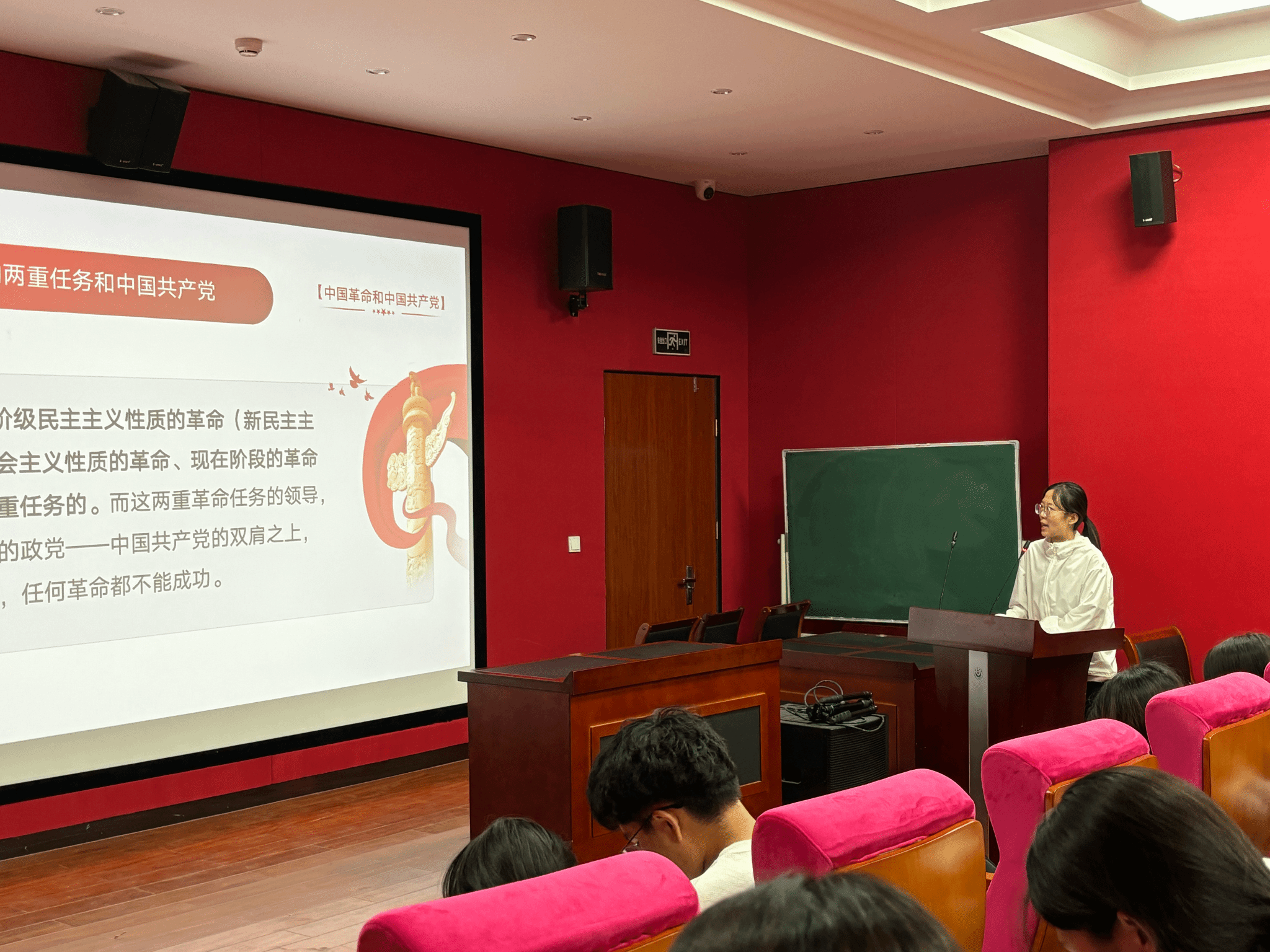 高瑜同学从写作背景、写作内容与现实意义展开介绍。首先阐明了该篇文章的写作背景。1938年9月29日,中共扩大的六届六中全会在延安桥儿沟天主堂开幕,此次会议此次会议总结了抗战以来的斗争经验,纠正王明在抗日战争前期的右倾投降主义的错误,毛泽东在此次会议上提出“马克思主义中国化”这一命题后,将马克思主义中国化和中国化马克思主义相结合撰写了许多重要著作,本文《中国革命和中国共产党》就包含其中。其次,她总结性的介绍了文章的主要内容。这篇文章主要分为两部分,第一部分毛泽东结合中国实际情况,提出由于帝国主义的入侵加上帝国主义与国内封建主义相结合使当时的中国变成了半殖民地半封建的社会。第二部分毛泽东通过分析社会的主要矛盾以及革命的对象、任务、动力、性质和前途提出了中国革命的两重任务。最后,她通过阅读此篇文章聚焦到当下所处的历史阶段以及面临历史任务,总结反思出中国共产党要将马克思主义与中国国情相结合,担负起坚决奋斗的责任,以伟大自我革命开创新时代伟大社会革命的新局面。