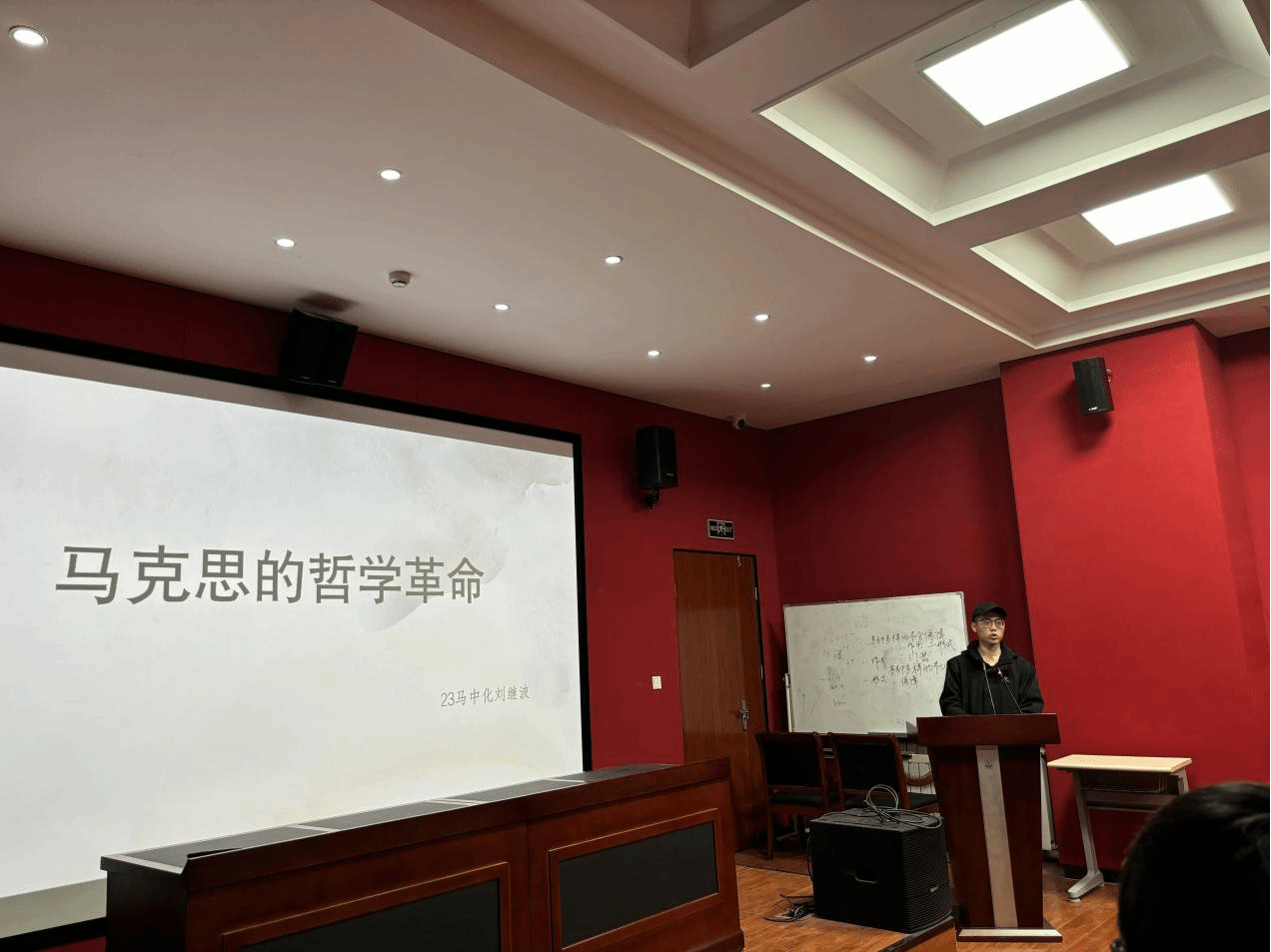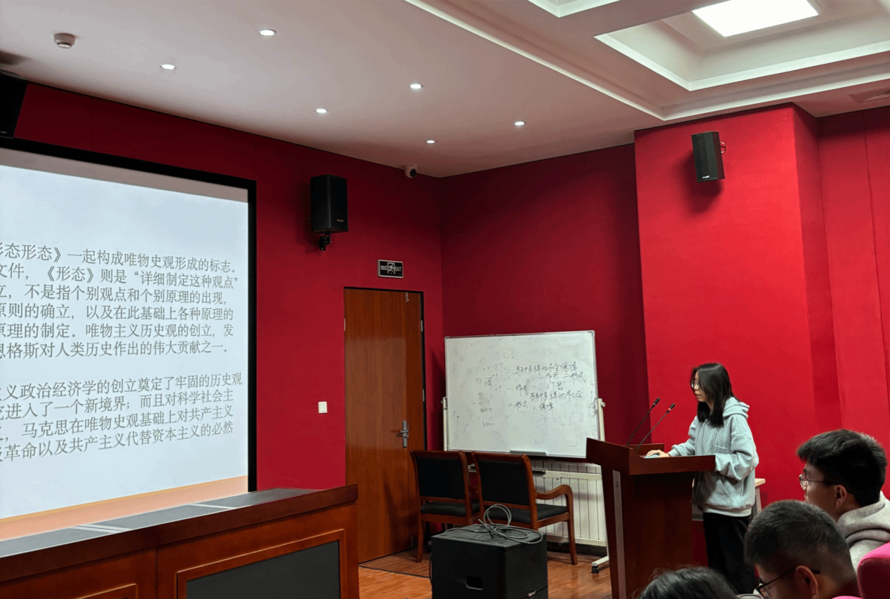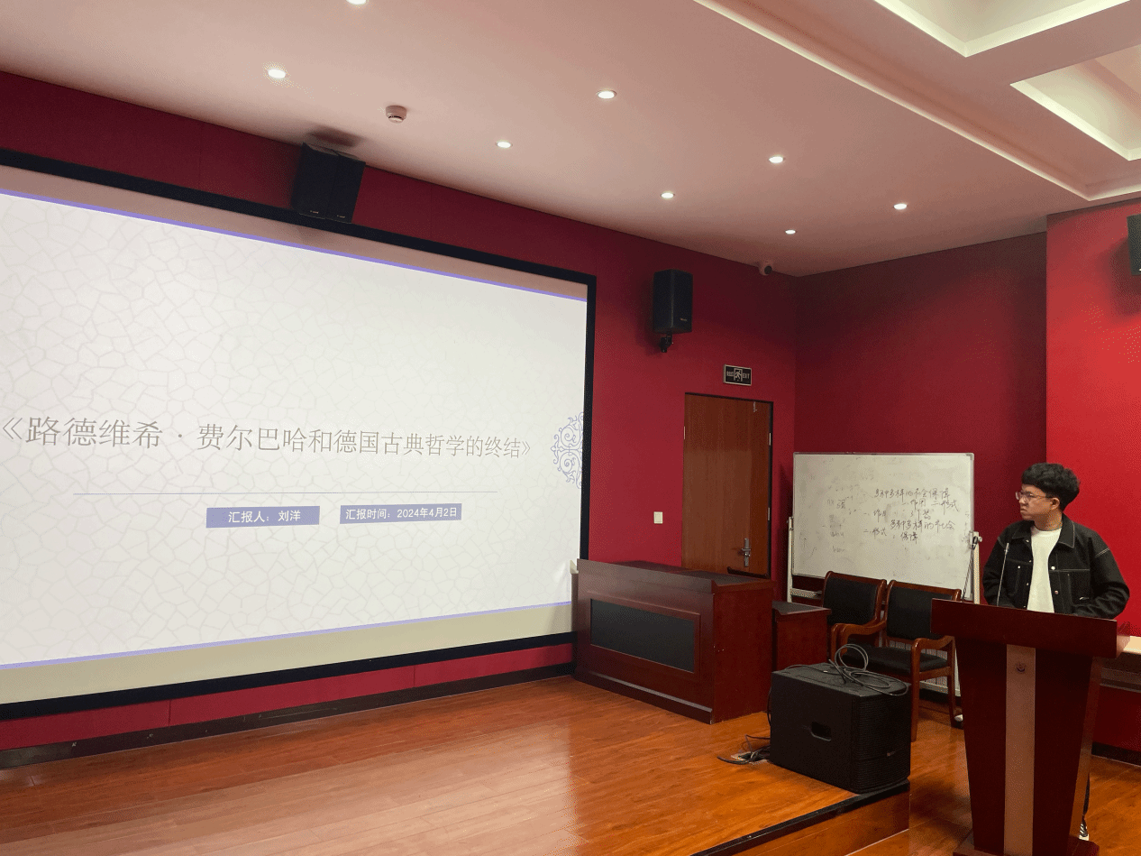 随后,刘继波同学以《德意志意识形态》为文本,讲述了马克思历史唯物主义思想的缘起与发展历程。马克思唯物主义思想起源于他在莱茵报时期遇到的物质利益难题,接着通过发表《黑格尔法哲学批判》导言等著作,完成了两个转变,推动历史唯物主义思想进一步发展,随后又通过发表《1844年经济学哲学手稿》开始质疑费尔巴哈的唯物主义思想,在《关于费尔巴哈的提纲》中完成了对费尔巴哈思想的清算,最终写下了《德意志意识形态》,形成了他的历史唯物主义思想。这标志着马克思主义哲学已经成熟,意味着马克思哲学革命的完成。马克思的历史唯物主义要求我们从所谓理性的领域当中深入到所谓生活世界当中去,并且在生活世界当中确立确定社会权力的基本方式,并且在社会权力的基本方式中来理解所谓依照理性人安排的权利,因此权利不过是社会权力采取的法律术语。