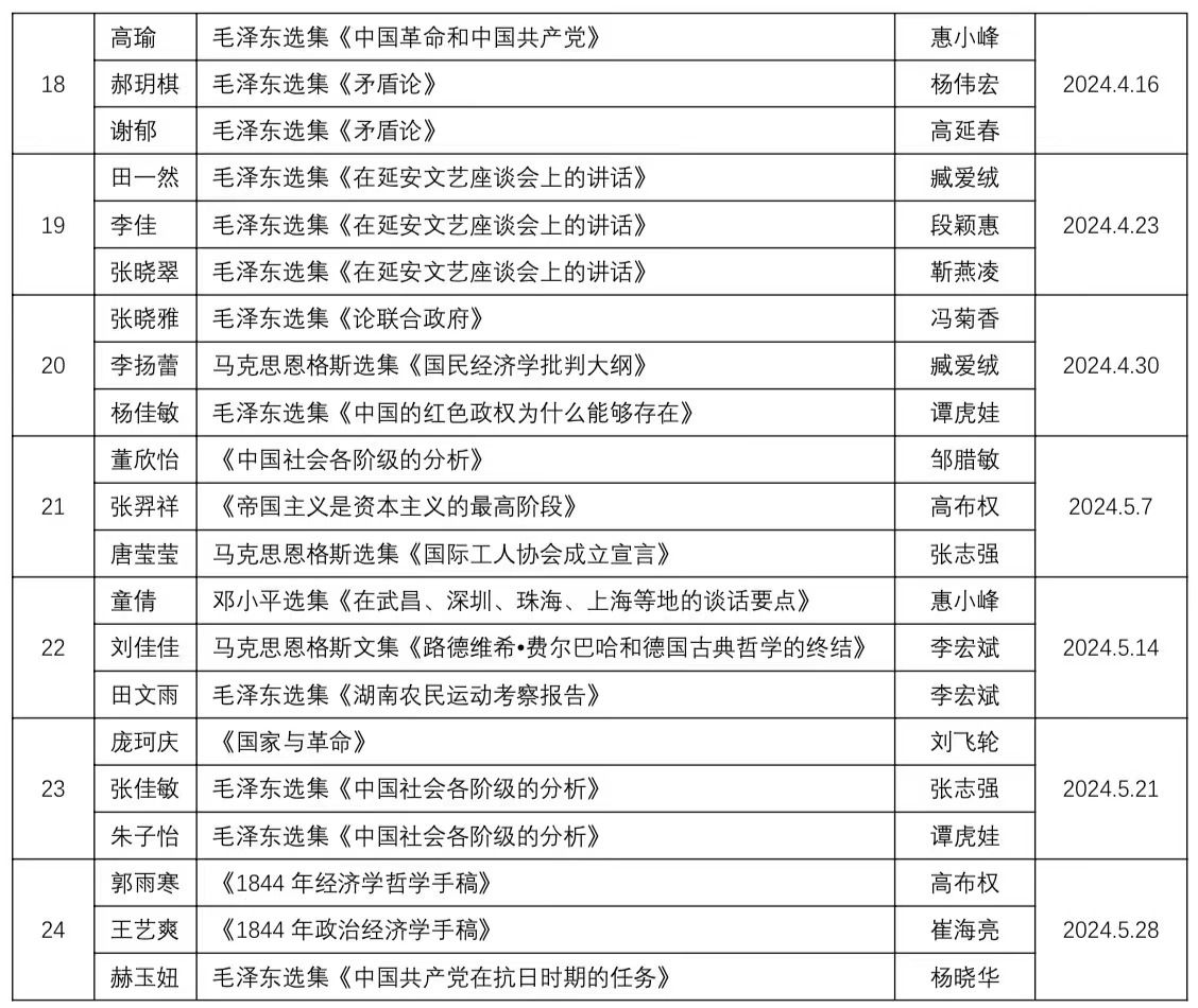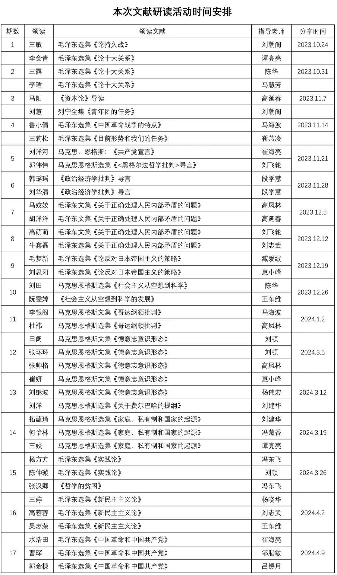 本次文献研读活动计划举办24期,公司举办此次研读活动,旨在引导2023级马克思主义理论专业研究生在新的历史条件下从整体上把握马克思主义的理论精髓与发展线索,理解新时代马克思主义的科学性、人民性、实践性和发展性等鲜明特征,扎实马克思主义理论专业的基础知识与文献功底。