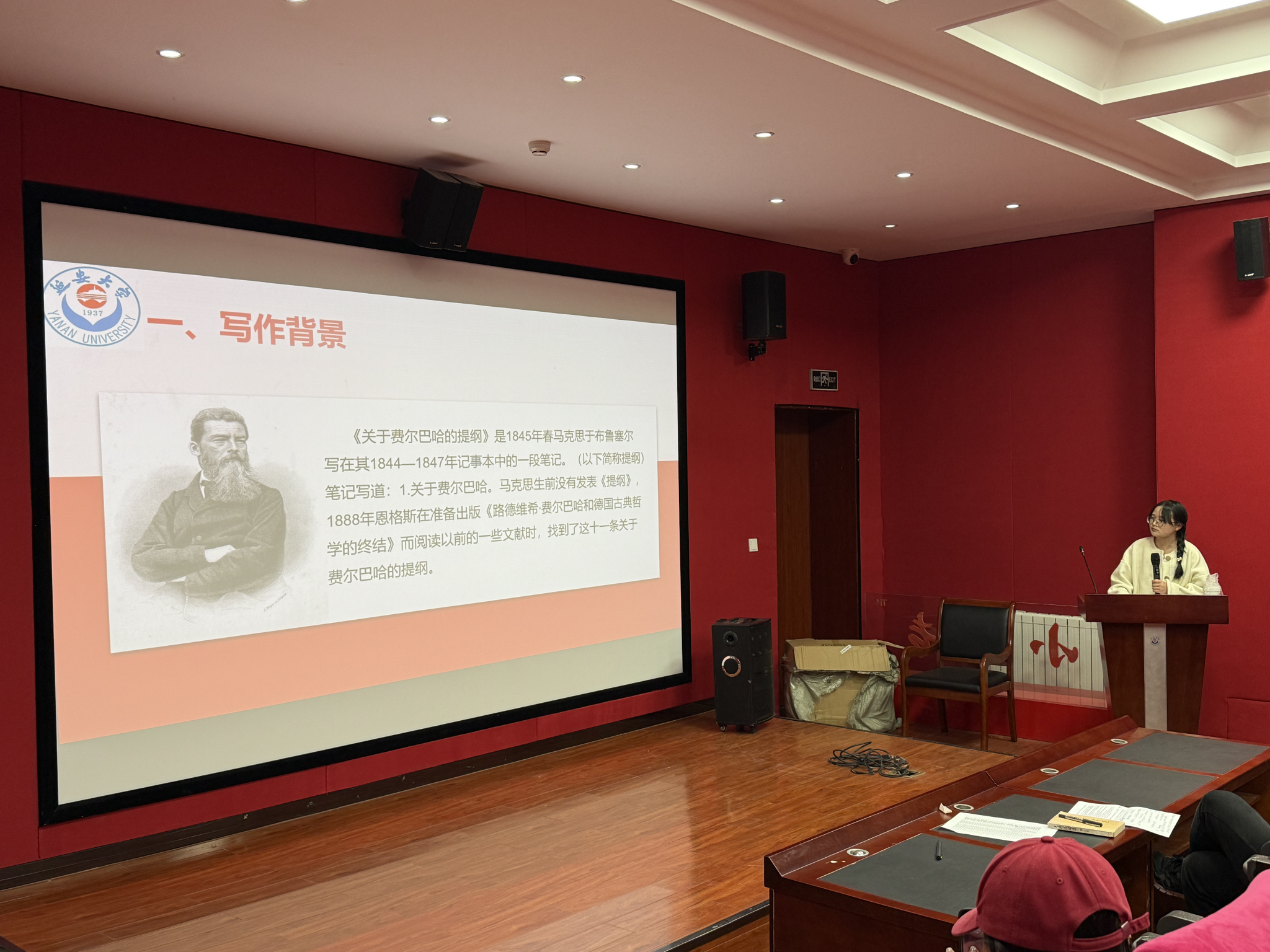 2025年5月14日,“马克思主义经典文献研读” 系列学术活动迎来第六十期,活动在体育365官网一楼报告厅顺利举行。此次读书会聚焦于马克思主义经典著作,围绕《反对本本主义》《实践论》《矛盾论》以及《关于费尔巴哈的提纲》四部经典文献展开深入研讨。活动中,2024级思想政治教育方向的硕士研究生陈明明、杨帆、王科琳三位同学依次登台,就各自研读经典文献的心得与见解作了详细报告分享。